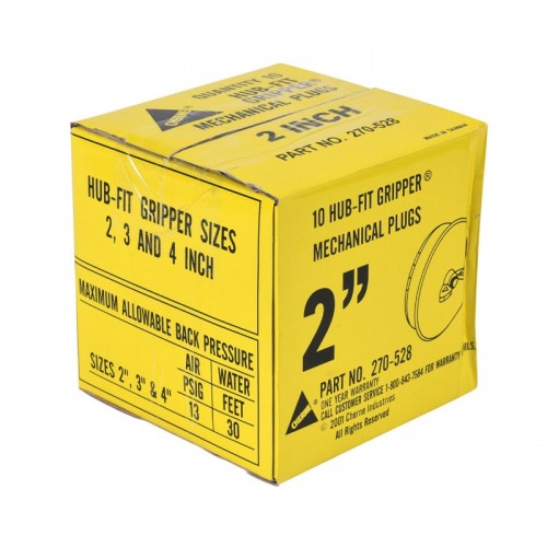 SKU 142508 Weight 1 Country of Manufacture Mfr. Model Number 270528 Link to User Manual No Link to Schematics No Link To Catalog No Technical Specifications Nominal Size: 2 in Weight: 3.3 oz Max Back Pressure: 13 psi/30 ft Product Type: Hub-Fit Gripper Plug Type: Blocking Material: Metal Color: Yellow Usage Range: 2.5 - 2.45 in Brand: Cherne Free Shipping No