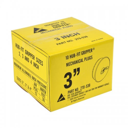SKU 142522 Weight 1 Country of Manufacture Mfr. Model Number 270538 Link to User Manual No Link to Schematics No Link To Catalog No Technical Specifications Usage Range: 3 - 3.53 in Max Back Pressure: 13 psi/30 ft Product Type: Hub-Fit Gripper Plug Type: Blocking Nominal Size: 3 in Color: Yellow Weight: 9.5 oz Material: Metal Brand: Cherne Free Shipping No