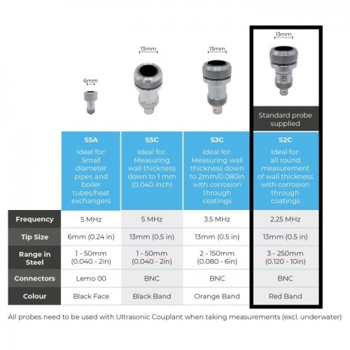 The performance of any ultrasonic thickness gauge relies heavily on the probe and its suitability to the material being measured. Therefore, selecting the right probe is vital. All Cygnus’ probes are made from stainless steel and have a hard wear face or a wear membrane to protect the probe.