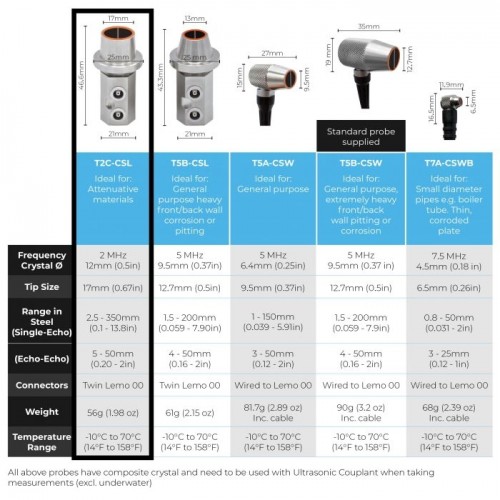 PROBE T2C TWIN CRYSTAL 2.0 MHZ 12MM W/COILED CABLE FOR DIVE THICKNESS GAUGE