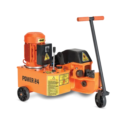 The Power 24 is ideal for construction sites, precast yards, and mobile steel fabrication operations that require a dependable, portable cutting machine. Its small footprint (around 21 × 31 inches) and wheel-mounted body make it easy to move and operate even in confined areas. The hydraulic mechanism provides quick, clean cuts without sparks or deformation, ensuring consistent results and reducing operator fatigue. The machine’s 110 V configuration allows compatibility with North American job-site power systems, increasing convenience and flexibility.
