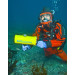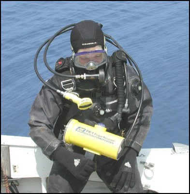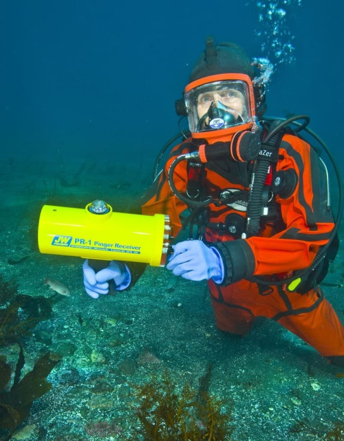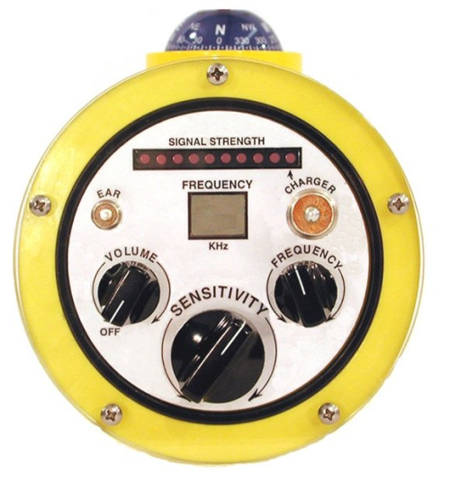 The PR-1 is a highly advanced pinger receiver that will quickly locate any pinger transmitting a frequency between 3 KHz and 97KHz. The receiver can be carried by a diver or deployed from a boat using the optional Boat Deployment Kit.The Operating the receiver is easy; select the frequency to be located and scan the area with a 360 degree sweep. When the diver points the receiver in the direction of the pinger, an audio alarm sounds through the underwater earphone and the LED light bar flashes. By reducing the sensitivity of the receiver the diver can obtain an exact direction to the pinger's location. As the diver swims in that direction a compass mounted on top of the receiver provides the precise heading. As the diver approaches the pinger, the audio tone gets louder and the receiver's light bar flashes more LEDs.