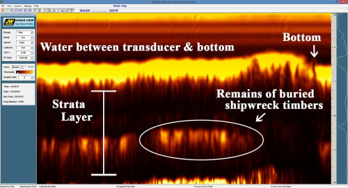 The provided laptop computer is fully equipped with Fishers' SONAR VIEW for Sub Bottom Profiler software. The SONAR VIEW software gives the sub bottom operator complete control of all system functions with easy to use pull-down menus and icons on the screen. Size measurement tool annotation and auto bottom tracking all standard. The operator can change colors, ranges, amplifier gain, and other controls with a click of the mouse. With the computer, sub bottom images can be stored in memory for playback and post processing at any time in the future. Small file sections including screen shots can be copied for emailing. With the GPS connected to the computer the position coordinates are captured with the data. When a GPS is connected, the mouse cursor can be placed on any object on the screen and its position coordinates will be displayed. Sonar files can be stored on the computer's hard drive.